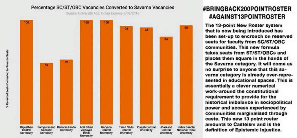 However, the 13-point roster considers each department as one unit. So, for at least one appointment from each reserved category to be applicable, there must be a minimum of 14 appointments made (hence the term 13-point roster). This can have a severely adverse impact on reservation and hence the anger among marginalised communities.