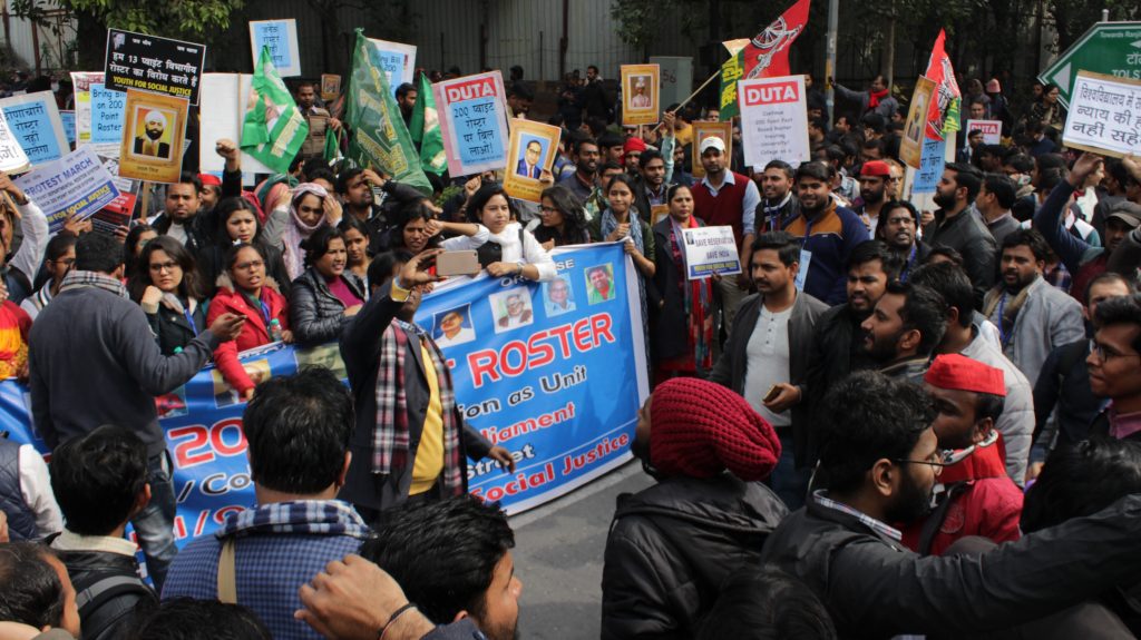 On January 31, 2019, a protest march was organized from Mandi House to the Parliament Street on the 13 point roster issue. It was in response to the recent Supreme Court judgement which upheld the Allahabad High Court’s verdict on treating a department of a university as a unit for reservations in recruitment instead of the earlier method of treating a university as a unit.