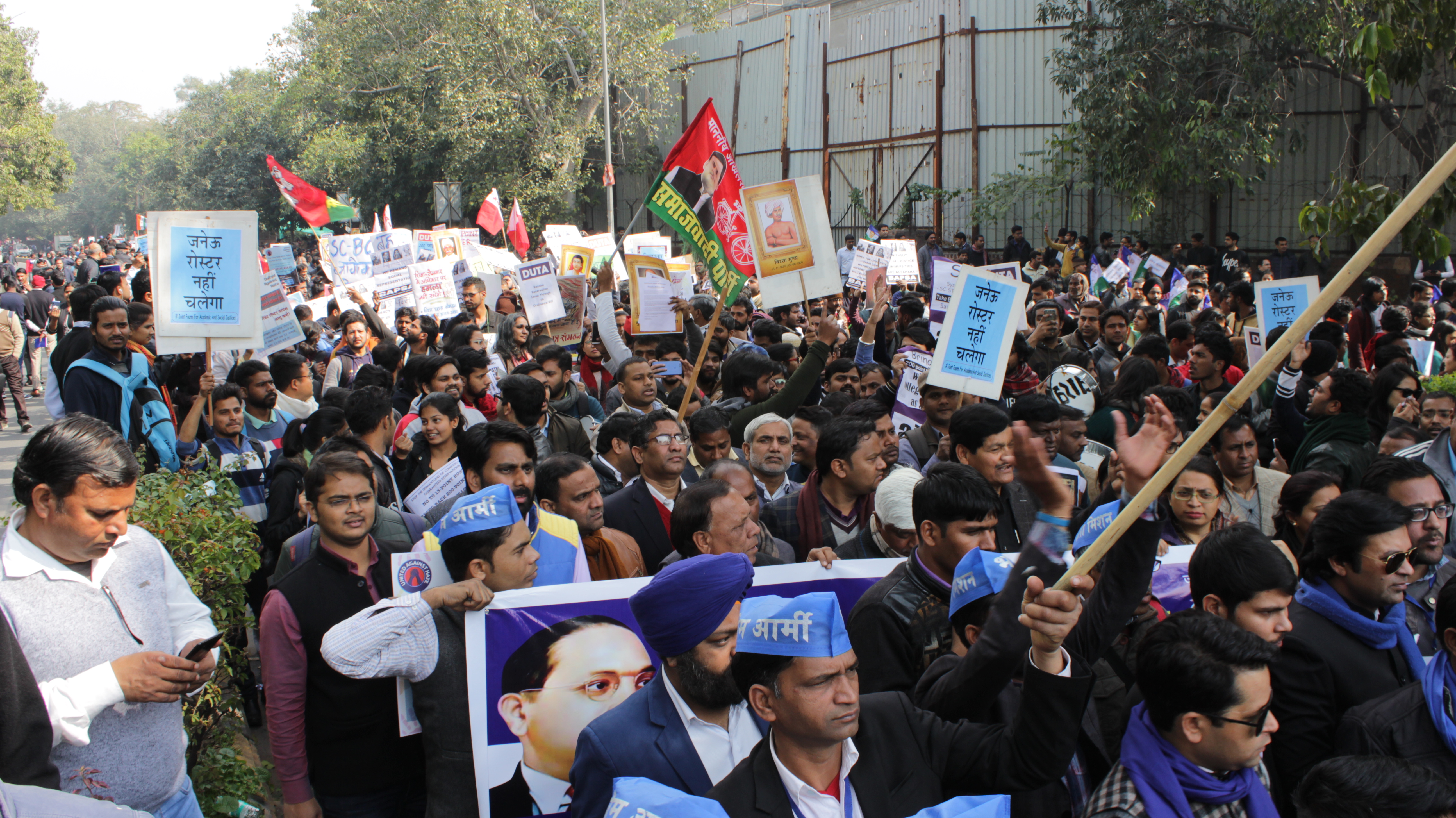 On January 31, 2019, a protest march was organized from Mandi House to Parliament Street on the 13 point roster issue. It was in response to the recent Supreme Court judgement which upheld the Allahabad High Court’s verdict on treating a department of a university as a unit for reservations in recruitment instead of the earlier method of treating a university as a unit. The department-wise reservations in recruitment also bring 13 point roster method which is skewed against SC, ST, OBC groups and renders the constitutional reservations for these groups ineffective.