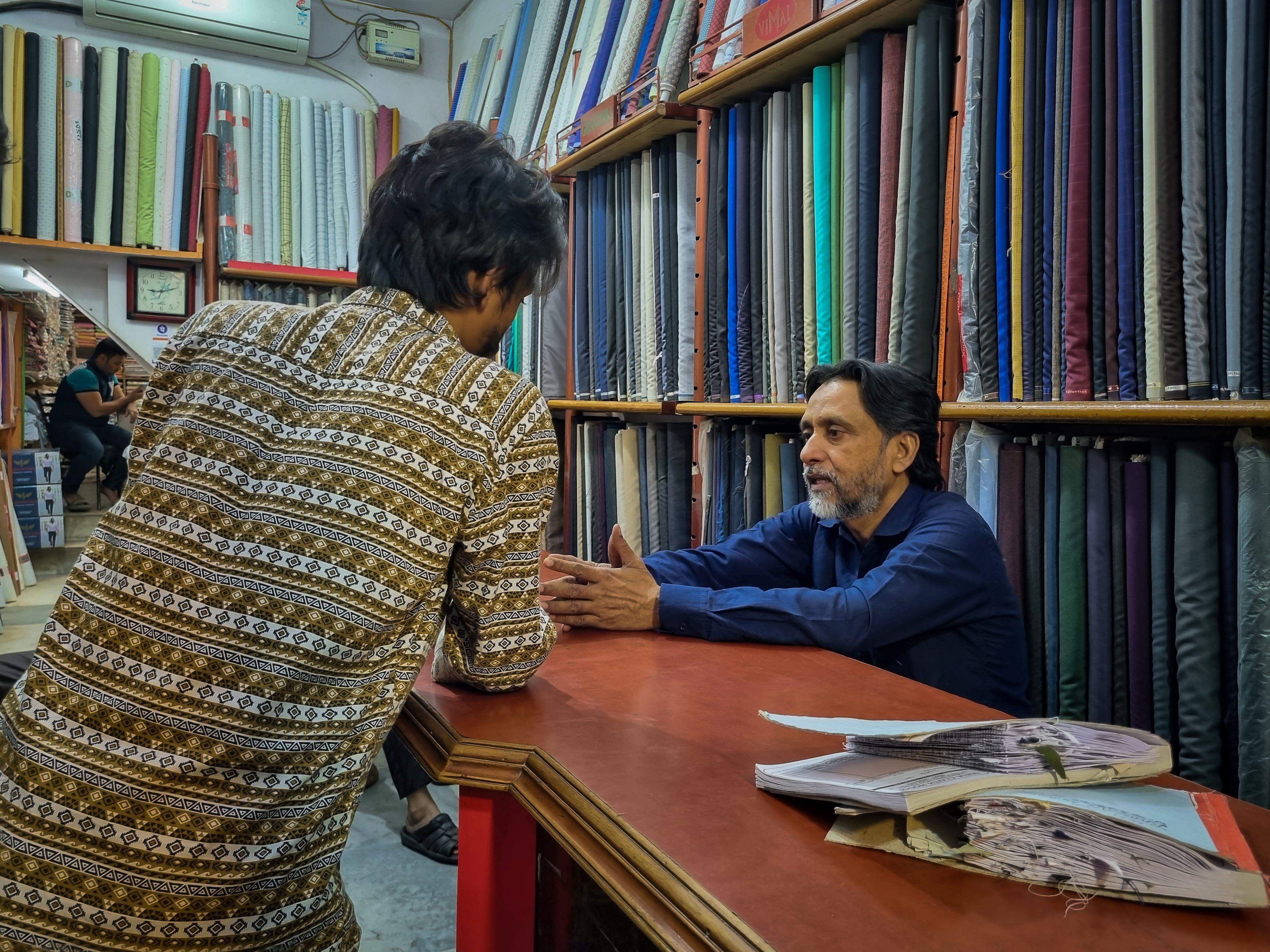 After Iftar, he returns to work, as a significant number of customers starts to arrive at the shop. He stands behind a wooden table, displaying textiles of different materials and colours to the customers according to their liking. Khan's knowledge and experience in the industry have helped him assist customers in choosing the perfect fabric for their needs.