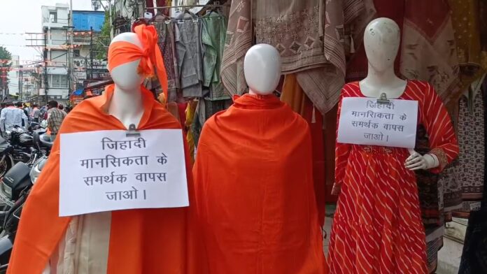 Outside the police station, Hindutva activists displayed bangles to Singh and accused him of supporting “jihadis”. Across the market, saffron flags were raised and posters declared it a “jihad-free market”.
