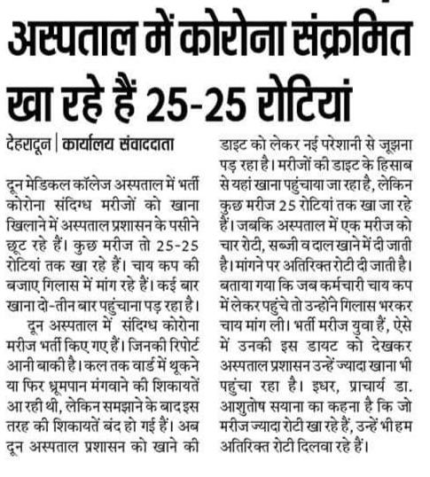 दून मेडिकल कॉलेज में तबलीग़ जमात के कुछ मरीजों को क्वारनटाइन किया गया है। अभी इनकी रिपोर्ट आनी बाकी है। कई स्थानीय अख़बारो ने ख़बर प्रकाशित की थी कि यहां जमात के लोग 25-25 रोटी खा रहे हैं। अस्पताल के प्रचार्य