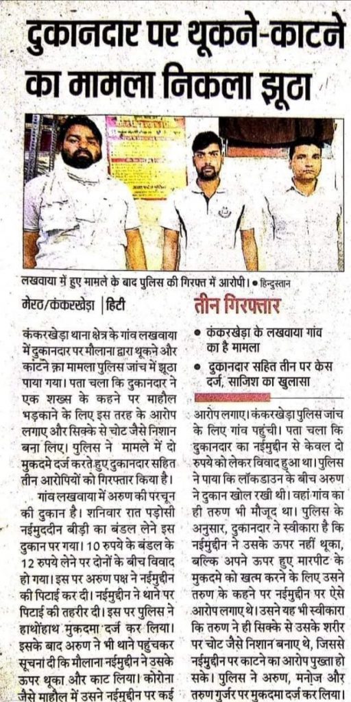यह मामला मेरठ के कंकरखेड़ा थाना क्षेत्र के लखवाया गांव का था। शनिवार रात में यहां तबलीग़ जमात से जुड़े एक स्थानीय शख्स नईमुद्दीन का अपने एक पड़ोसी से बीड़ी का मंडल के 10 रुपये की बजाय 12 लेने को लेकर विवाद हो गया था। इसके बाद अरूण पक्ष ने नईमुद्दीन की पिटाई कर दी। नईमुद्दीन इसके बाद थाने में शिकायत करने चला गया। इसके बाद अरुण भी थाने पहुंचा और उसने बताया कि नईमुद्दीन ने उसपर थूका और हाथ मेंं काट लिया। जिससे उसे संक्रमण हो जाए। अरुण ने यह भी कहा कि नईमुद्दीन मानव बम है। वो ज्यादा ज्यादा हिंदुओ को संक्रमित करने की धमकी दे रहा था। पुलिस की ईमानदाराना जांच में यह सामना आया कि अरुण को ऐसा करने के लिए एक स्थानीय नेता तरुण गुर्जर ने भड़काया था। उसी ने सिक्के से अरुण के चोट के निशान बनाए थे। इसके बाद पुलिस ने षड्यंत्र फैलाने और समाज मे कटुता भरने की साजिश के आरोप में अरुण और तरुण सहित उनके एक और साथी को गिरफ्तार कर लिया।
