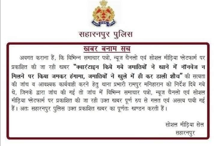 सहारनपुर जनपद के रामपुर मनिहारन थाना क्षेत्र में भी तबलीग़ जमात को क्वारनटाइन किया है। शनिवार को मीडिया के ख़ास वर्ग ने इनके बारे में झूठी ख़बर बनाकर प्रकाशित कर दी। जिसमे कहा गया है इन लोगो ने नॉनवेज खाना न मिलने खाना फेंक दिया और खुले में शौच कर दिया। कई बड़े मीडिया समूह ने इस ख़बर को प्रमुखता से दिखाया। रामपुर के कोतवाल छोटे सिंह ने बताया कि यह पूरी तरह झूठी ख़बर थी। वो इसका खंडन करते हैं। हुआ बस यह था कि एक जमाती ने खाना खाने के बाद डिसपोजल प्लेट डस्टबिन में न डालकर खिड़की के बाहर डाल दी थी। उसी पर यह बतंगड़ बन गया। बाद में जनपद के वरिष्ठ पुलिस अधीक्षक की और से भी इस ख़बर को झूठा बताते हुए खंडन जारी किया गया।