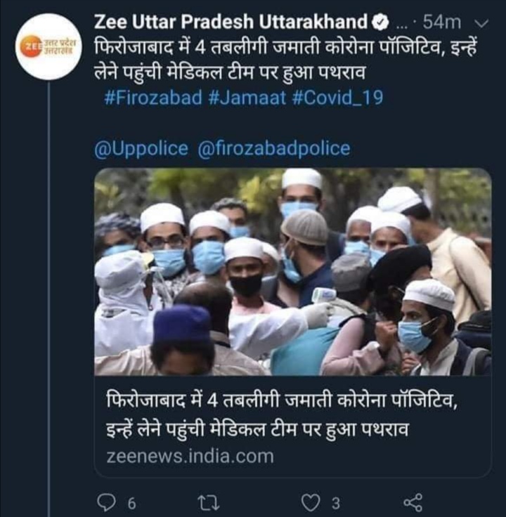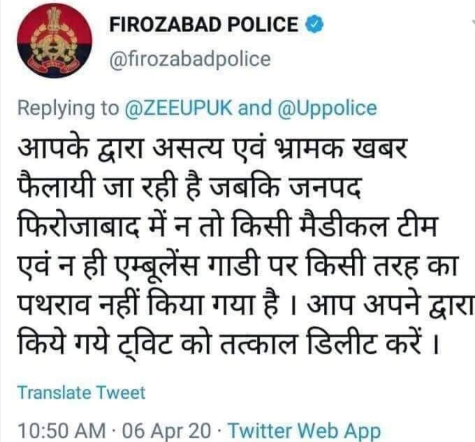 6 अप्रैल सोमवार को दोपहर 12 बजे ज़ी न्यूज़ उत्तर प्रदेश उत्तराखंड के टवीटर से फिरोज़ाबाद में 4 तबलीग़ी जमात के लोगोंं को कोरोना पॉज़िटिव बताया गया। बाद इन्हें लेने गई मेडिकल टीम पर पथराव की कहानी गढ़ दी गई। यह जमात से लौट कर आये हैंं। बाकी जानकारी टेस्ट के साथ पता चलेगी। मगर इसके बाद फिरोज़ाबाद पुलिस उखड़ गई। उन्होंने तुरंत जवाब लिखा।आपके द्वारा असत्य एवें भ्रामक खबर फैलाई जा रही है। जबकि फिरोज़ाबाद में न तो किसी मेडिकल टीम और न ही एम्बुलेंस गाड़ी पर किसी भी तरह का कोई पथराव नही किया गया है। आप अपने द्वारा किए गए ट्वीट को तुरंत डिलीट करें इसके बाद ट्वीट डिलीट कर दिया गया। फिरोज़ाबाद के एसएसपी सचीन्द्र पटेल ने बताया कि ख़बर झूठी है और वो कार्रवाई करने जा रहे हैं।