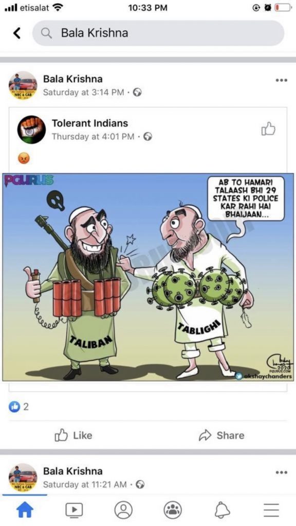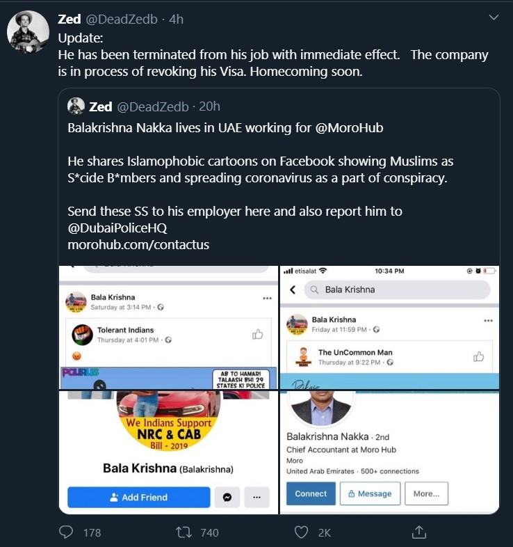 Another Balakrishna Nakka, Chief Accountant at Dubai’s Moro Hub Data Solutions Company had posted a cartoon showing Muslims as suicide bombers and spreading the Coronavirus. Appalled by Nakka’s comments, Moro Hub sacked him and said in their official statement that they “take zero tolerance attitude to material that is or may be deemed Islamophoic or hate speech.”