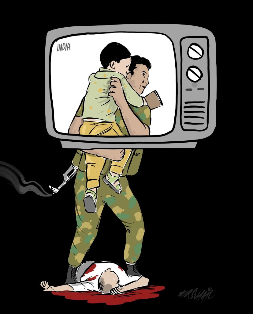 The flurry of gory images of a three-year-old child atop his dead grandfather, his arms stretched backwards, after losing his life during an alleged shootout at Model Town in northern Kashmir’s Sopore area on Wednesday, also pained Kashmir’s artists and cartoonists. Their telling illustrations and cartoons show how the tragedy of the child was exploited and used by a pliant media and politicians from the ruling regime to serve their anti-Kashmir narrative.