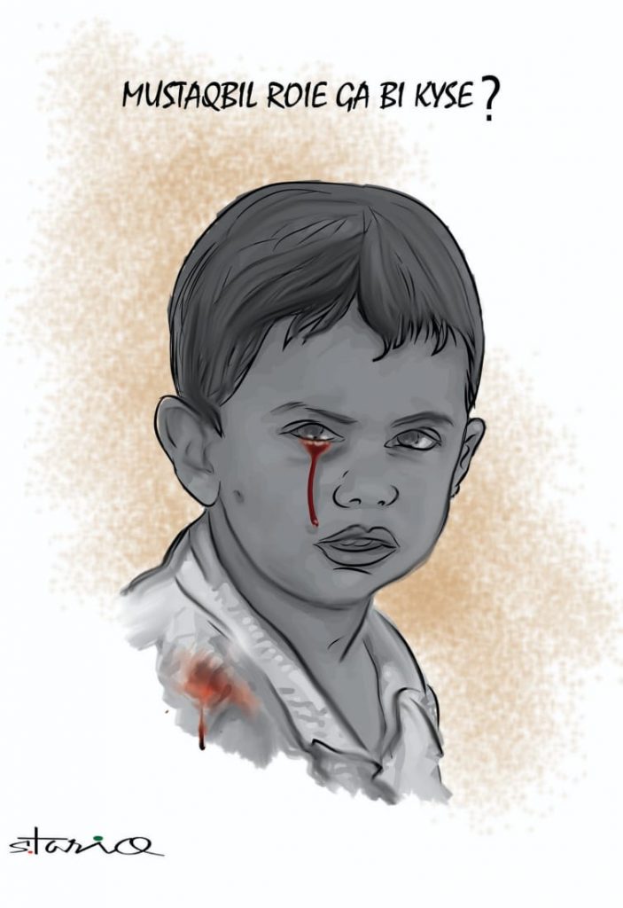 In his viral cartoon for a local newspaper, political cartoonist S. Tariq replicated an image of the terrified three-year-old child with bloodstains on his clothes. Instead of tears, blood is dripping from his eye. The illustration is captioned: “mustaqbil roie ga bi kyse?” (How could future cry?)