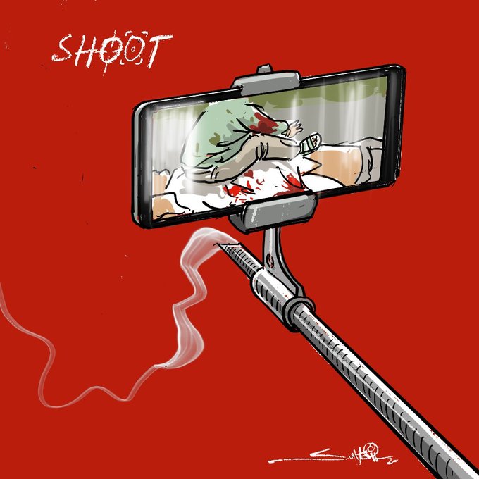 Noted political cartoonist and painter Suhail Naqshbandi in his illustration on the incident, which went viral on social media, showed a mobile camera attached to the nozzle of the gun in a red background. The attached camera is shooting the images of the terrified toddler on the dead body of his grandfather.