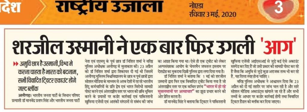 The reports said that Nishit Sharma complained about AMU students and ex-students’ use of social media to tarnish the image of India and targeting the Hindu employees in Arab countries. He asked the SP to take strict actions against it and to investigate the connections with Pakistan’s secret agencies and terror organizations. Manvendra had said that many suspicious Twitter handles relating to Pakistani intelligence agency ISI have been suspended by Twitter. The Superintendent of Police had assured that complaint is being investigated.