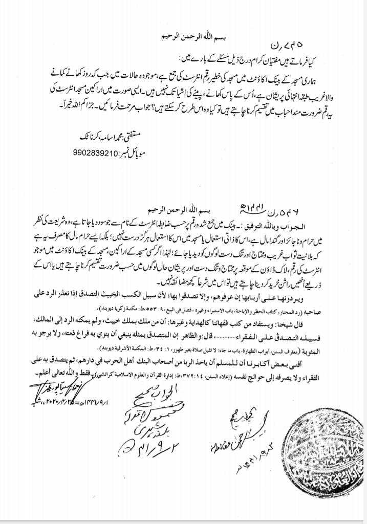 फ़तवा के अनुसार जवाब दिया गया कि ब्याज़ इस्लाम मे पूरी तरह हराम है लेकिन लॉकडाऊन के दौरान बैंक से आपकी जमा पर मिले ब्याज़ से तंगहाल और ज़रुरतमंद लोगो की मदद की जा सकती है। ब्याज़ की इस रक़म को व्यक्तिगत रूप से और मस्जिद के लिए इस्तेमाल नहींं किया जा सकता। अलबत्ता इस रक़म से को ग़रीबों की मदद की जा सकती है। इसमे शरअन कोई हर्ज नही हैं।इससे अगर आप किसी को राशन खरीद कर देना चाहते हैं, तो यह अच्छा है। ऐसा किया जा सकता है। इससे दो बड़े फायदे हैं। एक तो आप ब्याज़ लेने से बच जाएंगे और दूसरे किसी जरूरतमंद की मदद भी हो जाएगी।