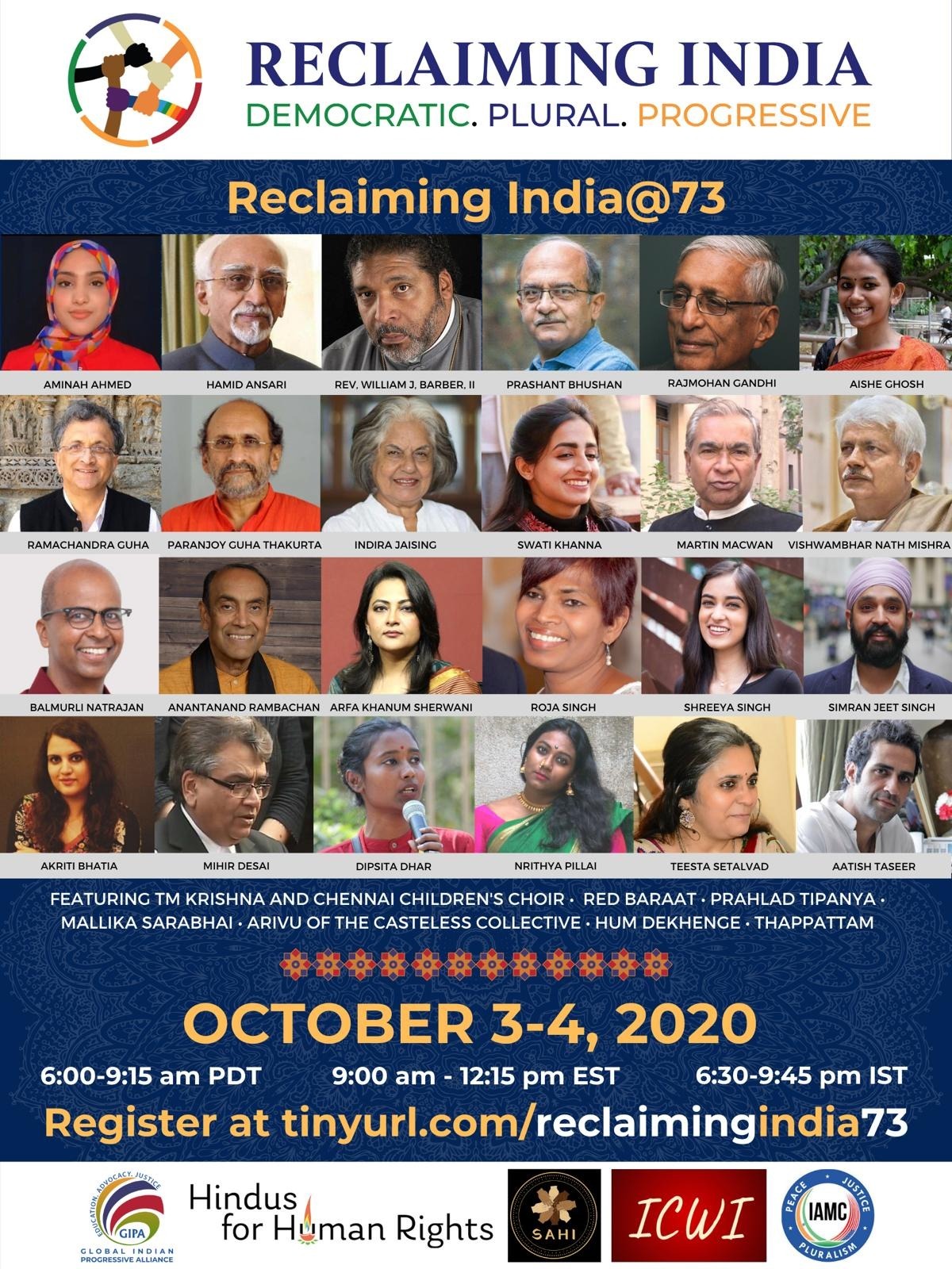 Mohammad Hamid Ansari (Former Vice President of India), Prof. Rajmohan Gandhi (Historian and a Grandson of Mohandas Gandhi) and Rev Dr William Barber (Co-Chair of the Poor People’s Campaign), Atishi Marlena (MLA, Aam Admi Party Delhi), Shashi Tharoor (Member of Parliament, Indian National Congress) and other leaders and activists to Address ReclaimingIndia@73 Virtual Conference, Oct 3rd and 4th, 2020 on Defending Democratic Values and Countering Hindu Nationalism and Casteism in Both India and the United States.