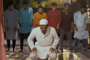 " इबादतें मस्जिदों की चार दीवारों तक सीमित नहीं हैं, दरअसल हमारे लिए तो पूरी दुनिया ही एक मस्जिद है",लॉकडाउन की वजह से मस्जिदों में जा पाने पर मोहम्मद शारीक अपने परिवार वालों के साथ घर पर नमाज़ पढ़ते हुए।[/caption]