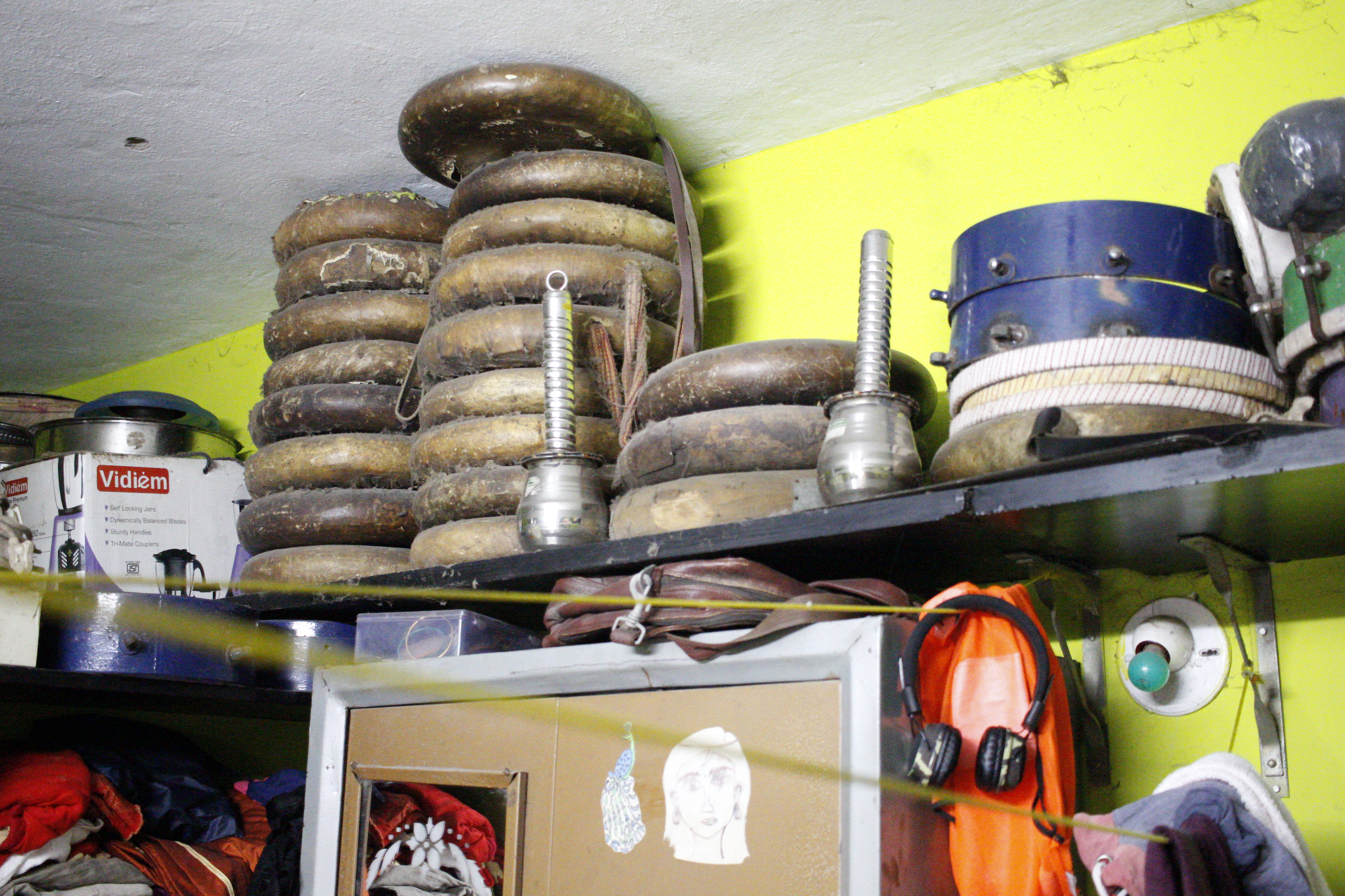 Parai and other instruments shelved in his house. | Photo by Shalini S[/caption]