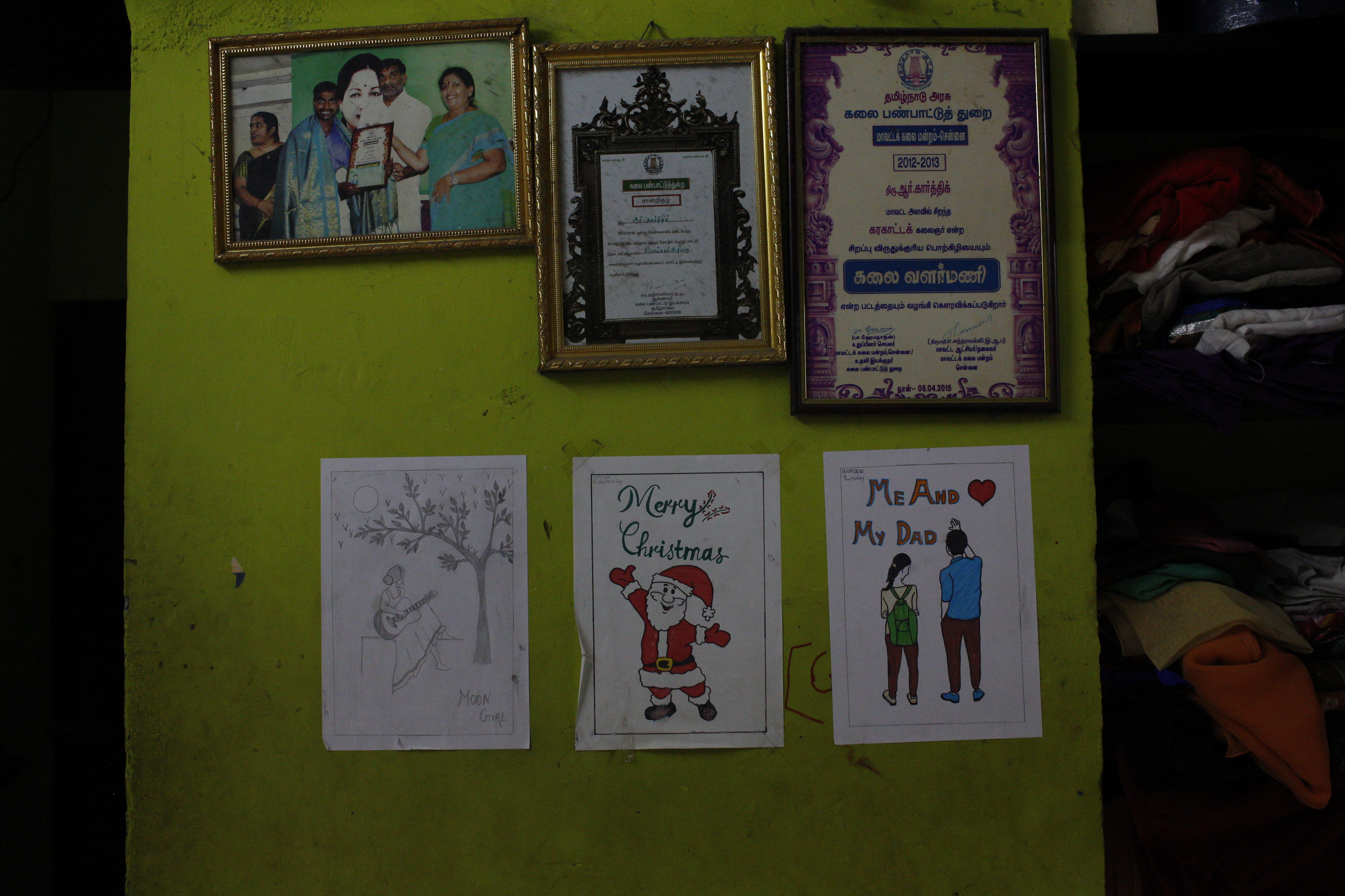 Laminated picture of Kalai valarmani award and drawings by his eldest daughter Kalaivani are put up on the wall. | Photo by Shalini S[/caption]