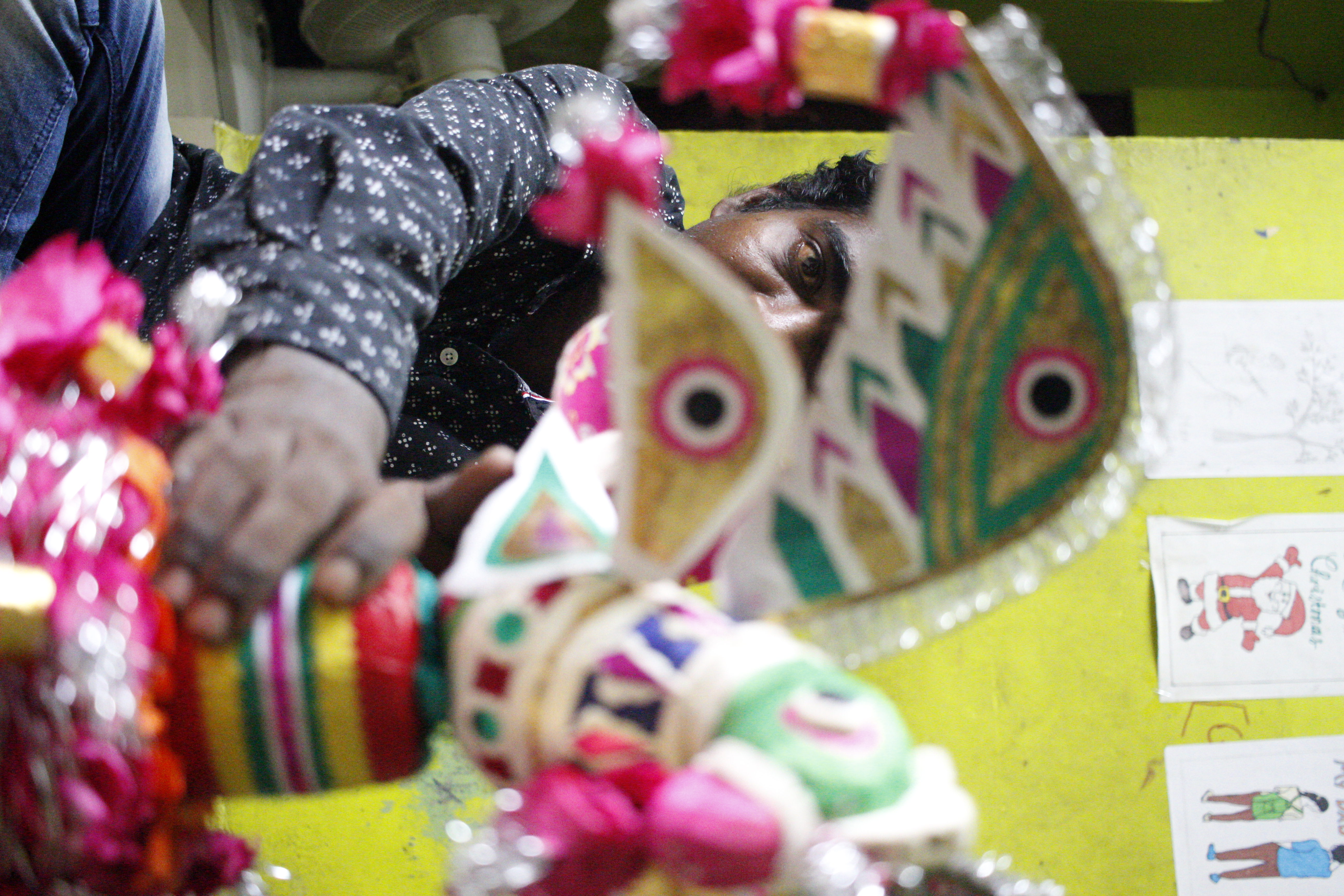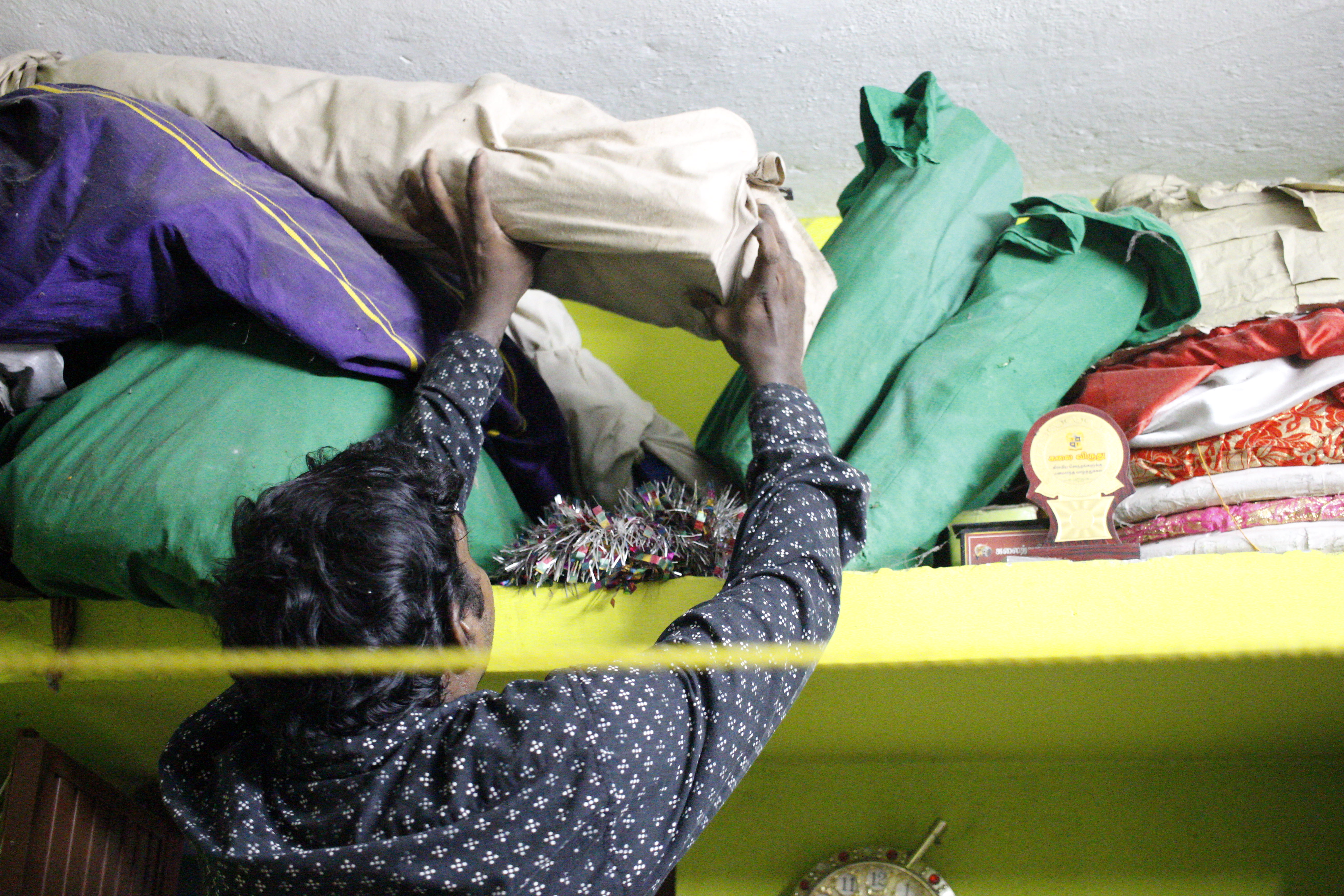 Karthick Annan looked content and relaxed as he spoke passionately about the art forms. He expressed his willingness to teach whoever approached him for free. Usually, he sleeps right after coming home from work to wake up early in the morning again for work. He said he was overwhelmed to spend his evening unshelving the art supplies that were covered with cobwebs. However, they had to be put back in the almirah by him after showing it to me. “We cannot keep many things inside since it is a very small house. My wife went to her mother's house because it is crammed here. She was angry at me for not cleaning the dust," he said with an apologetic smile.