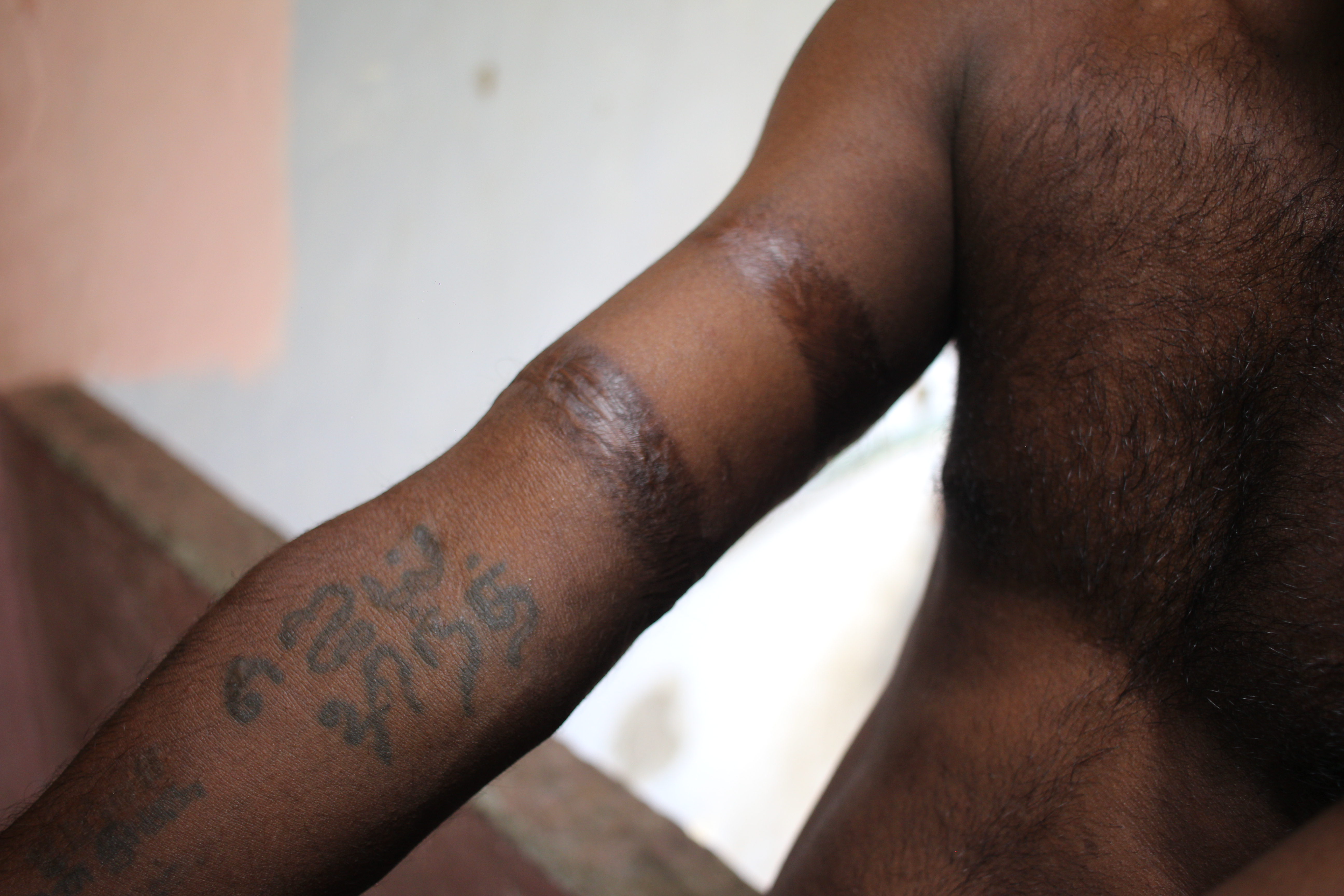 Jai Hind in Tamil is tattooed on his right hand and the scars are from performing fire dance. | Photo by Shalini S[/caption]