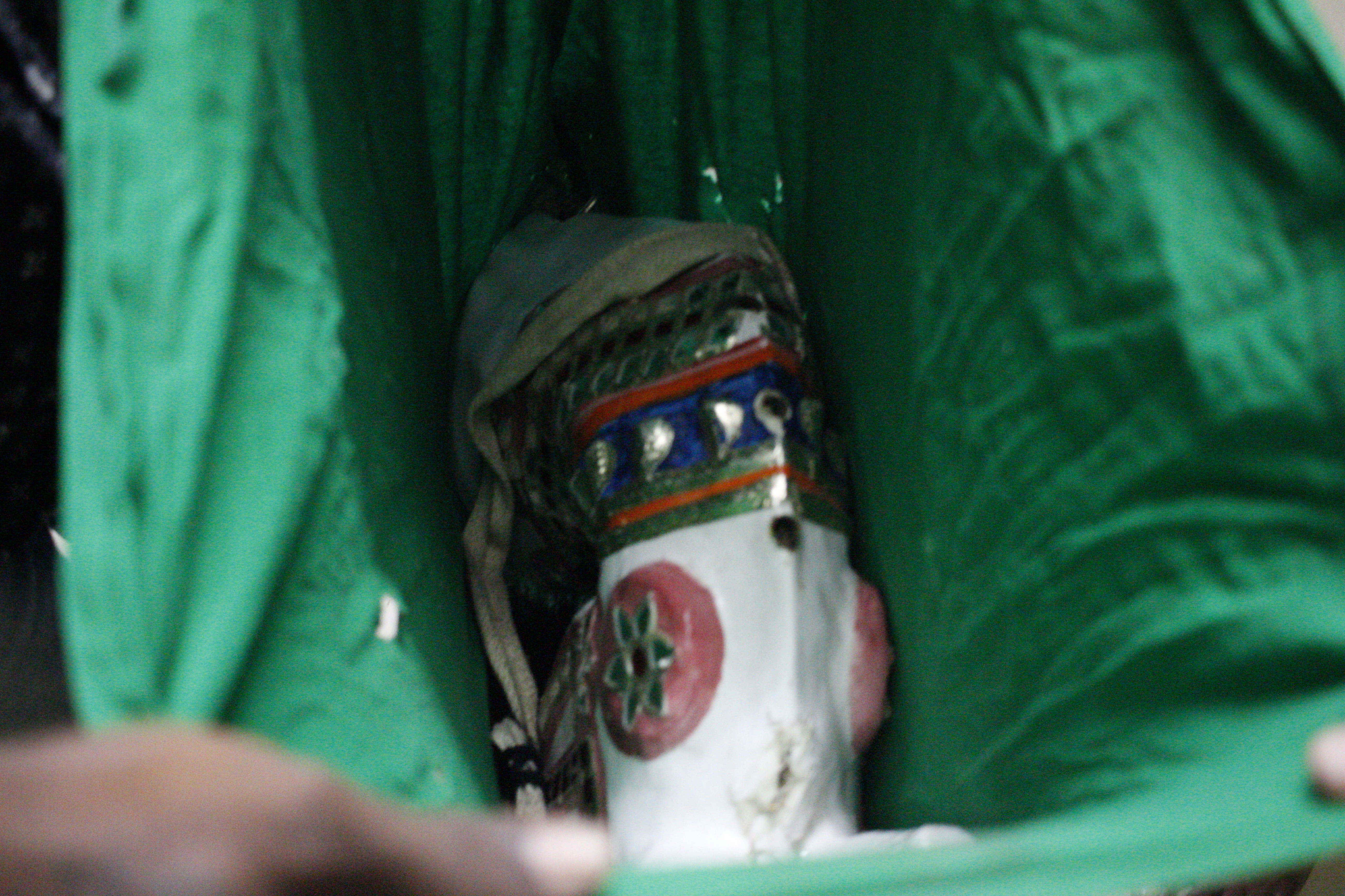 A horse head used while performing “poikkal kuthirai” – dummy horse dance – looks stifled in a green bag, to be sacked and put away. | Photo by Shalini S[/caption]