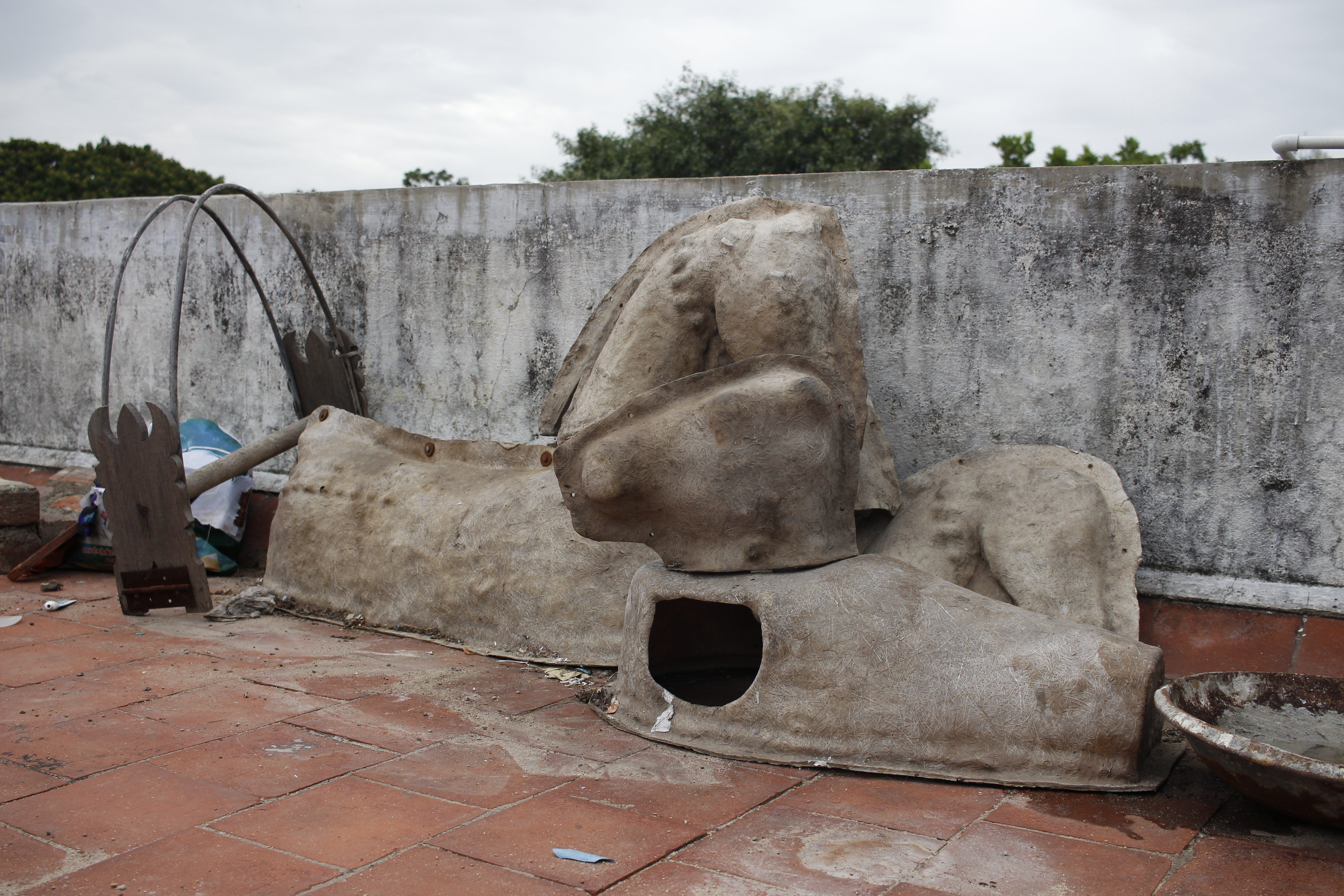 Moulds to make folk art supplies like the head and body of horses, body of peacock, and Kavadi lay bare in the housing board terrace. | Photo by Shalini S[/caption]