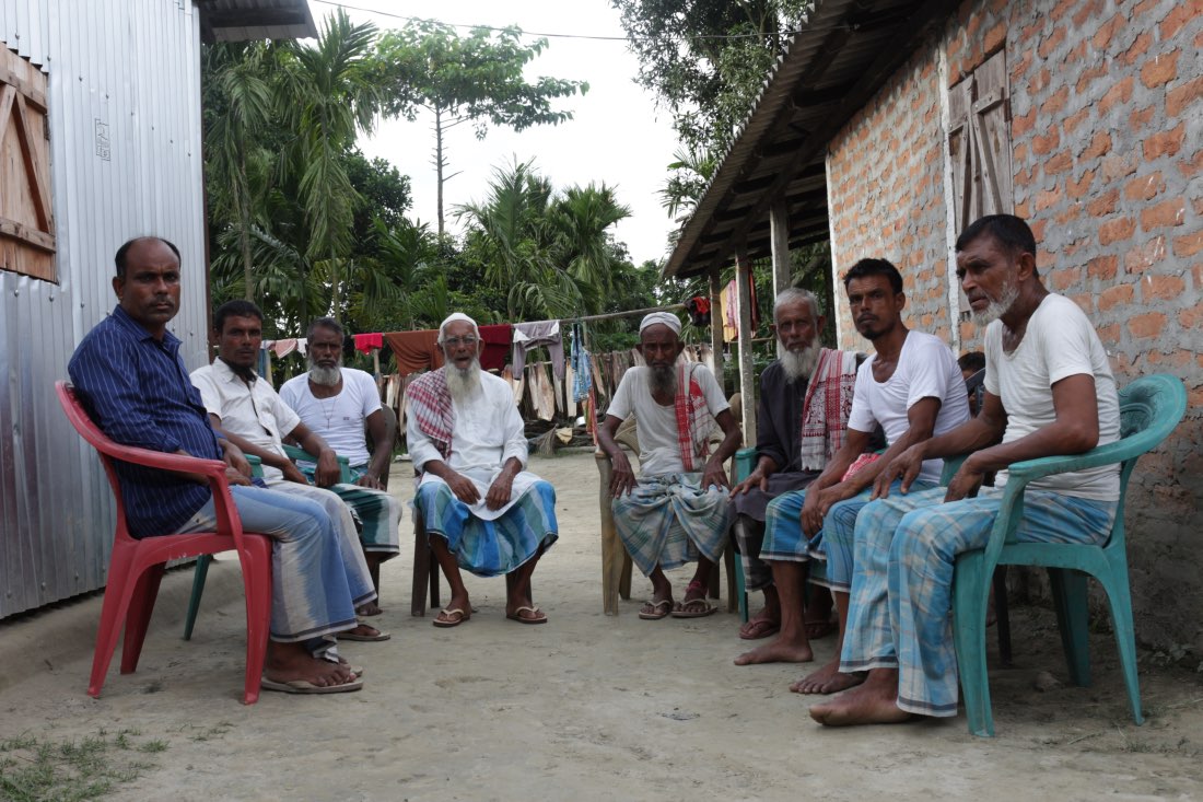 A group of elders who were one of the first settlers in the area after flood induced erosions displaced them from various villages in Assam sit together. These elders also witnessed the 1983 anti-immigrants riots of Assam. | Photo by Mahibul Hoque[/caption]