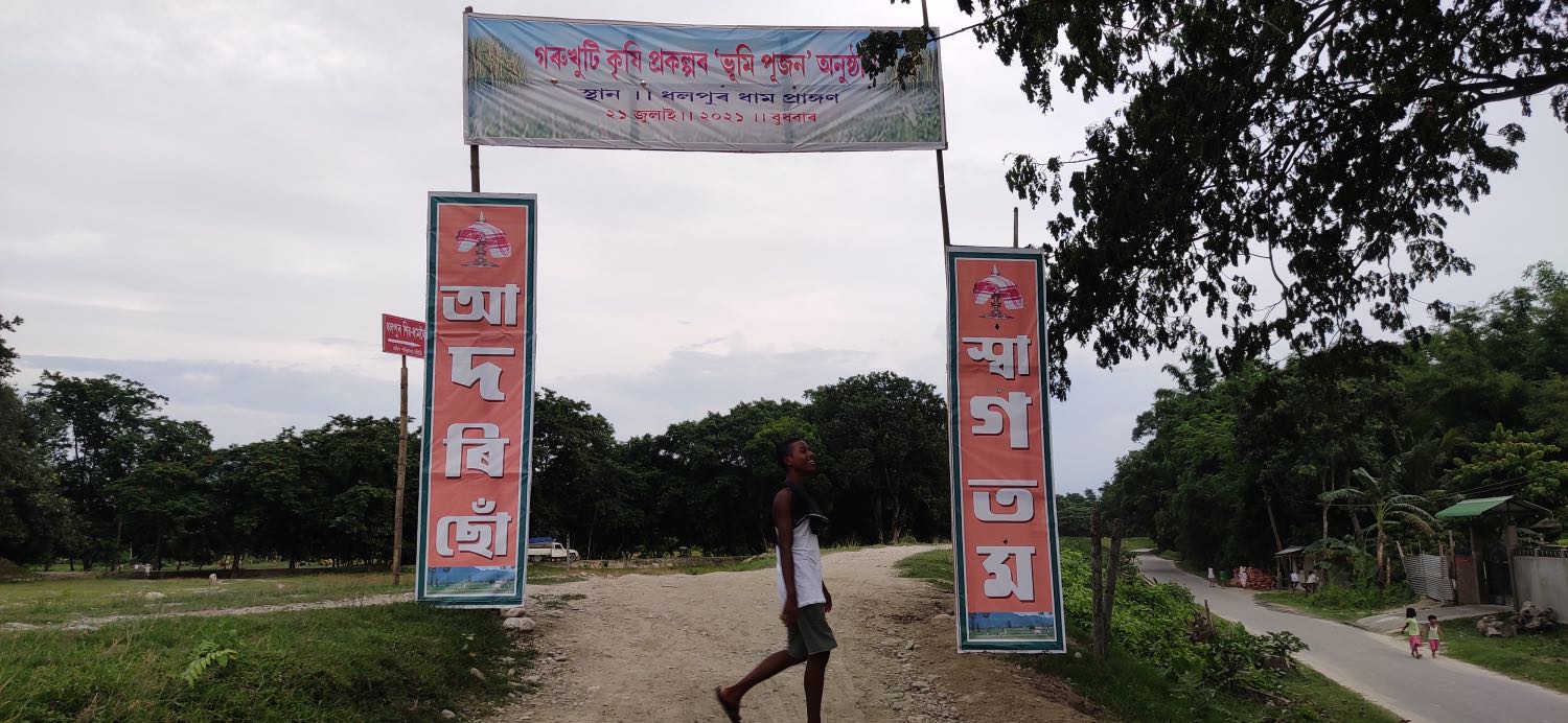 The gate erected by the Assam government at Gorukhuti for bhoomi pujan of the agricultural farm that the government intends to set up at the vast area evicting Muslim farmers. | Photo by Mahibul Hoque[/caption]