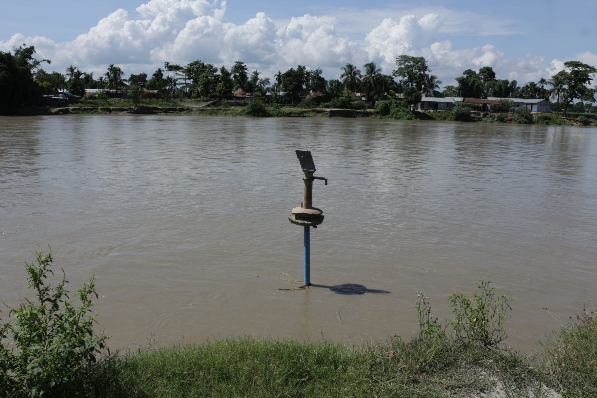 A tubewell stands alone in the current of Nonoi river at No 1 Dholpur village. The tubewell was used by a family before erosion displaced them. | Photo by Mahibul Hoque[/caption]