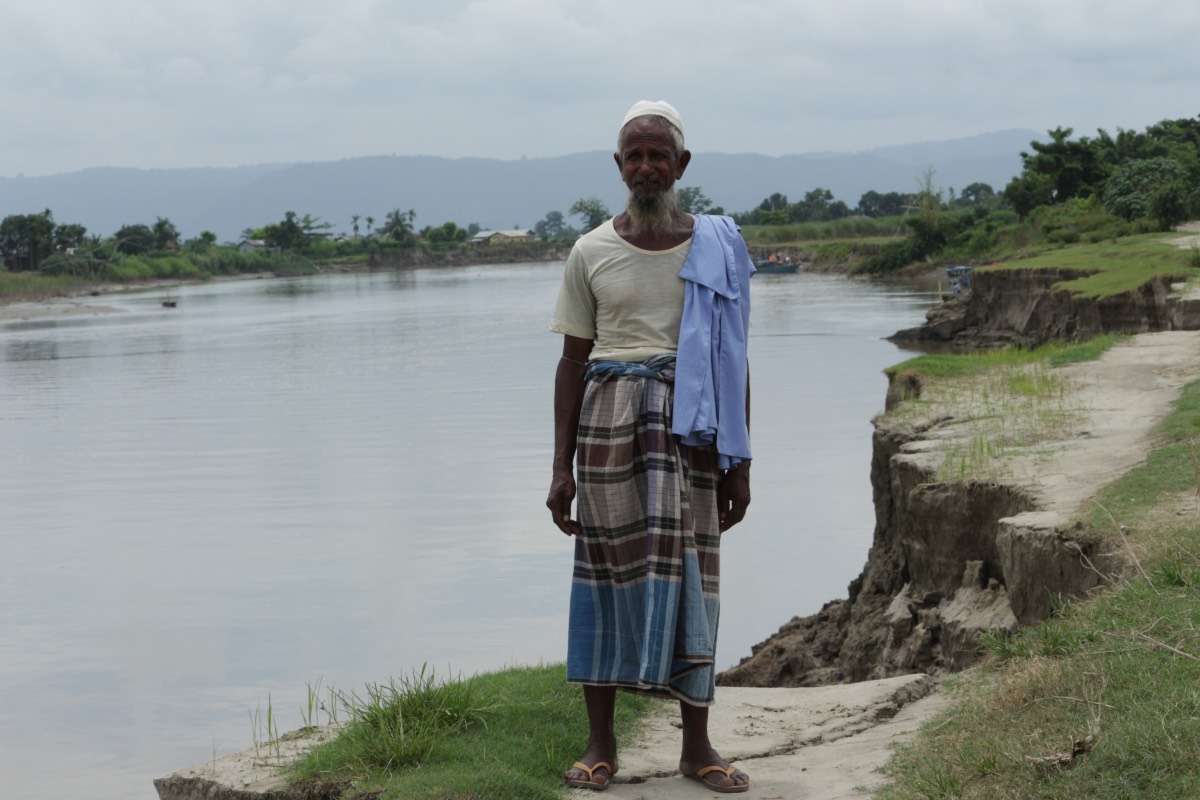 Munaf Ali, stands at an erosion affected site near Dhanbari Bazar. He joked about his fate that neither erosion nor displacement would ever leave him. | Photo by Mahibul Hoque[/caption]
