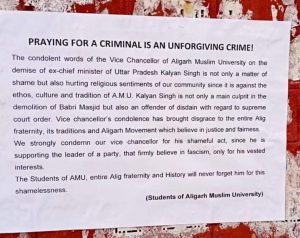 पोस्टर में आगे लिखा गया है कल्याण सिंह न सिर्फ बाबरी मस्जिद विध्वंस के मुख्य अपराधी थे बल्कि उच्चतम न्यायालय का आदेश नहीं मानने के गुनहगार भी थे। कुलपति द्वारा शोक व्यक्त किया जाना पूरी एएमयू बिरादरी के लिए शर्मनाक है। यह अलीगढ़ आंदोलन की परंपराओं के लिए भी निरादरपूर्ण है, जो न्याय और समता में विश्वास रखती हैं।