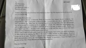 देश के प्रतिष्ठित विश्वविद्यालयों में शामिल अलीगढ़ मुस्लिम विश्वविद्यालय के एक छात्र ने एएमयू प्रशासन पर उसकी डिग्री वापस लेने का आरोप लगाया है। छात्र का आरोप है कि प्रधानमंत्री नरेन्द्र मोदी के भाषण की तारीफ करने पर उससे उसकी पीएचडी की डिग्री लेने का नोटिस भेजा है। वहीं दूसरी ओर अलीगढ़ मुस्लिम विश्वविद्यालय प्रशासन ने इन आरोपों का सिरे से ख़ारिज किया है। विश्वविद्यालय प्रशासन का कहना है कि छात्र को गलती से गलत नाम की डिग्री आवंटित हो गई थी, जिसे सही करने के लिए छात्र को नोटिस भेजा गया है। वहीं छात्र ने इस मामले में हाईकोर्ट में भी अपील की हैं। अलीगढ़ के सिविल लाइंस क्षेत्र के रहने वाले दानिश रहीम ने एएमयू से पीएचडी की पढ़ाई की है। दानिश ने एएमयू के भाषा विज्ञान विभाग से पीएचडी की हैं।