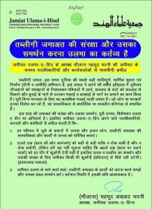 जमीयत उलमा-ए-हिंद के अध्यक्ष मौलाना महमूद मदनी ने जमीयत के कार्यकर्ताओं को पत्र लिखकर अपील की है कि तब्लीग़ी जमात के कार्यों का समर्थन करें। मौलाना महमूद मदनी ने कहा हैं कि तब्लीग़ी जमात का समर्थन करना हर उलेमा का कर्तव्य है क्योंकि तब्लीगी जमात इस समय दुनिया की सबसे बड़ी शांतिपूर्ण धार्मिक सुधार एवं निर्माण वाली जमात हैं। उन्होंने कहा कि तब्लीग़ी जमात एक अभियान हैं जिसने मुस्लिम नौजवानों को शराब खानों से निकालकर मस्जिद तक पहुंचाया है।