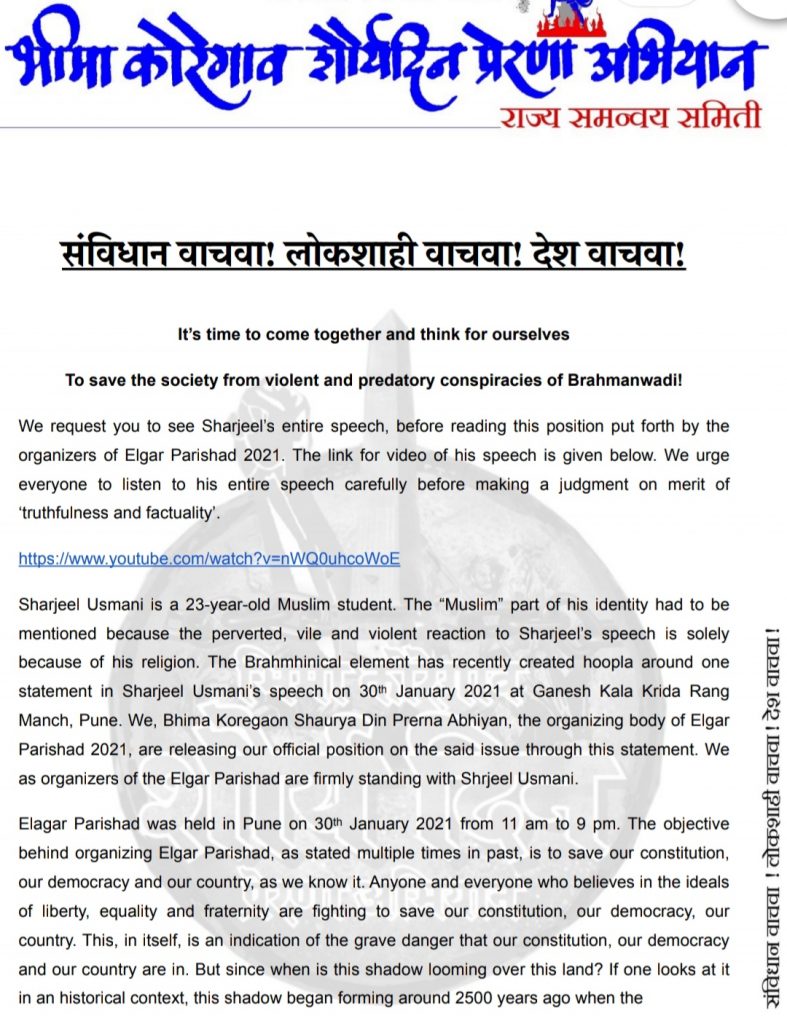 30 जनवरी को पुणे में 'एल्गार परिषद 2021' का आयोजन करने वाली संस्था ने अलीगढ़ मुस्लिम विश्वविद्यालय के पूर्व छात्र शरजील उस्मानी के समर्थन में बयान जारी किया है। भीमा कोरेगांव शौर्य दिवस प्रेरणा अभियान ने शनिवार को बयान जारी करते हुए कहा, 30 जनवरी 2021 को एल्गार परिषद में शरजील उस्मानी के एक बयान को ब्राह्मणवादी राष्ट्रीय स्वयंसेवक संघ, भारतीय जनता पार्टी और संघ परिवार ने गलत तरीके से पेश किया हैं'। आगे भीमा कोरेगांव शौर्य दिवस प्रेरणा अभियान ने अपने जारी बयान में कहा कि संघ परिवार ने फिर से शरजील को निशाना बनाकर अपनी जातिगत और सांप्रदायिक घृणा को बढ़ावा दिया है।