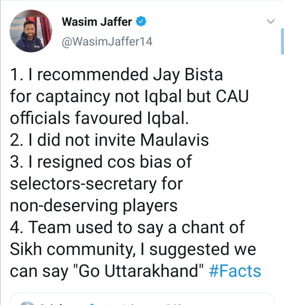 धार्मिक विवाद के चलते वसीम जाफर का इस्तीफा,कहा मेरी निष्ठा पर संदेह बेहद तकलीफ़देह