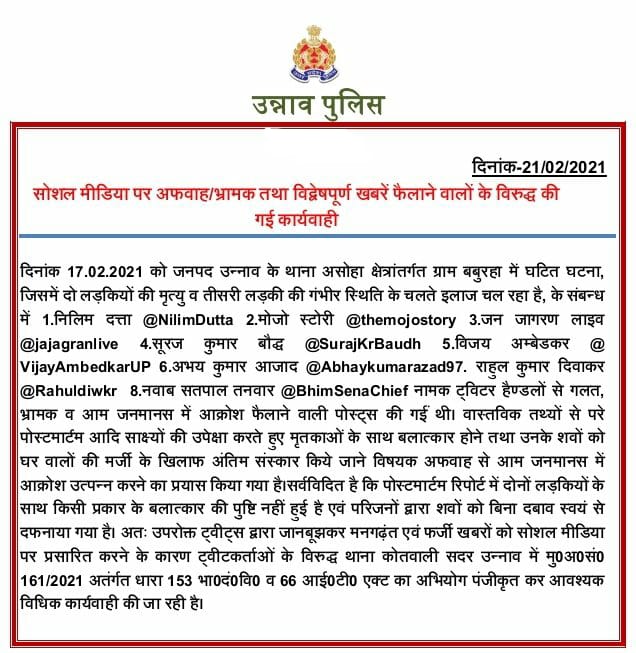 उन्नाव कोतवाली में निलिम दत्ता, मोजो स्टोरी, विजय अम्बेडकर, अभय कुमार आजाद, राहुल कुमार दिवाकर, सूरज कुमार बौद्ध, जन जागरण लाइव और नवाब सतपाल तनवार के खिलाफ जानबुझकर मनगढंत एवं फर्जी खबरों को सोशल मीडिया पर प्रसारित करने के आरोप में धारा 153 और धारा 66 आईटी एक्ट के तहत मुकदमा दर्ज किया गया है।