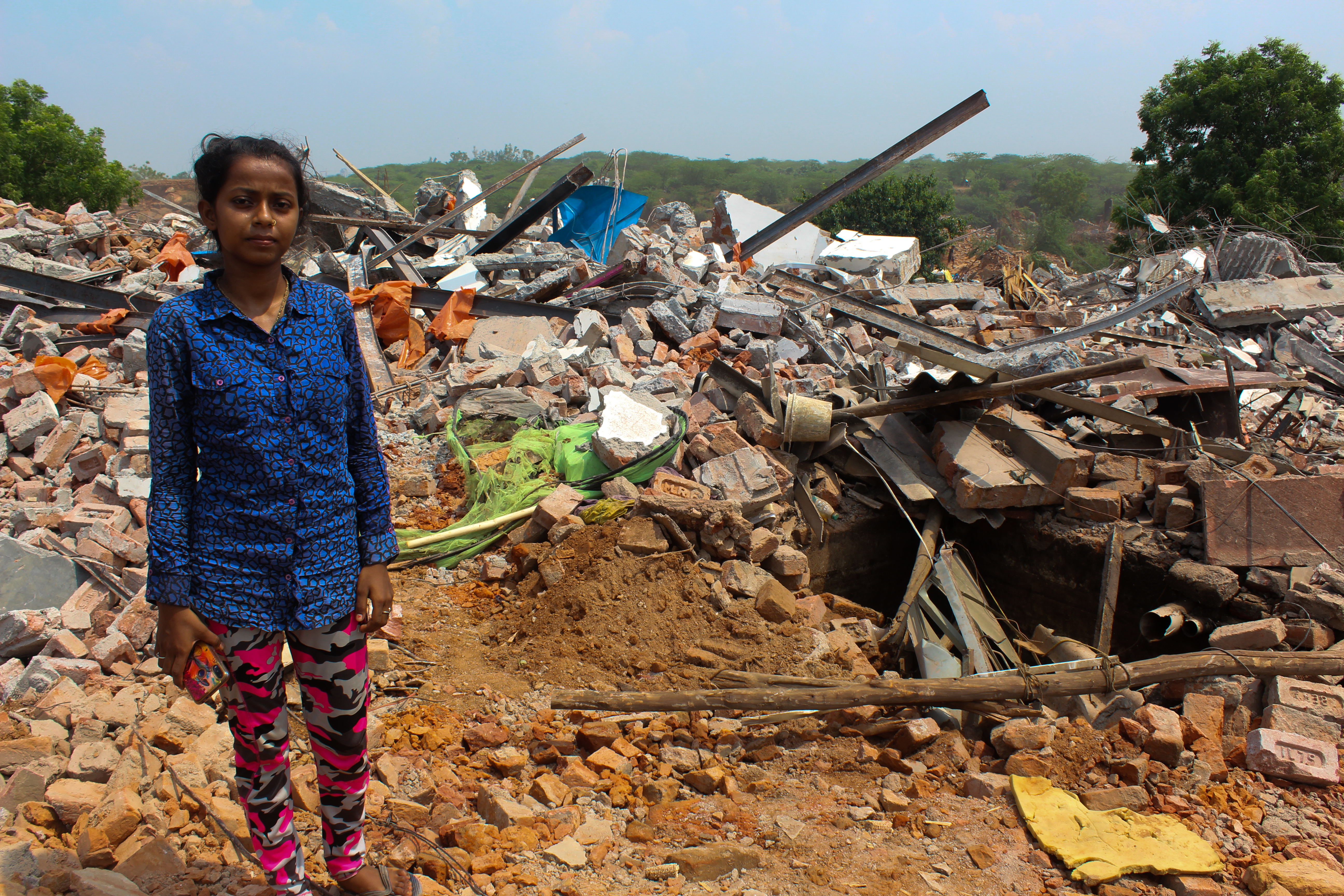 Versha Kumari, 23, stands on the debris of her home. | Photo by Shadab Farooq[/caption]