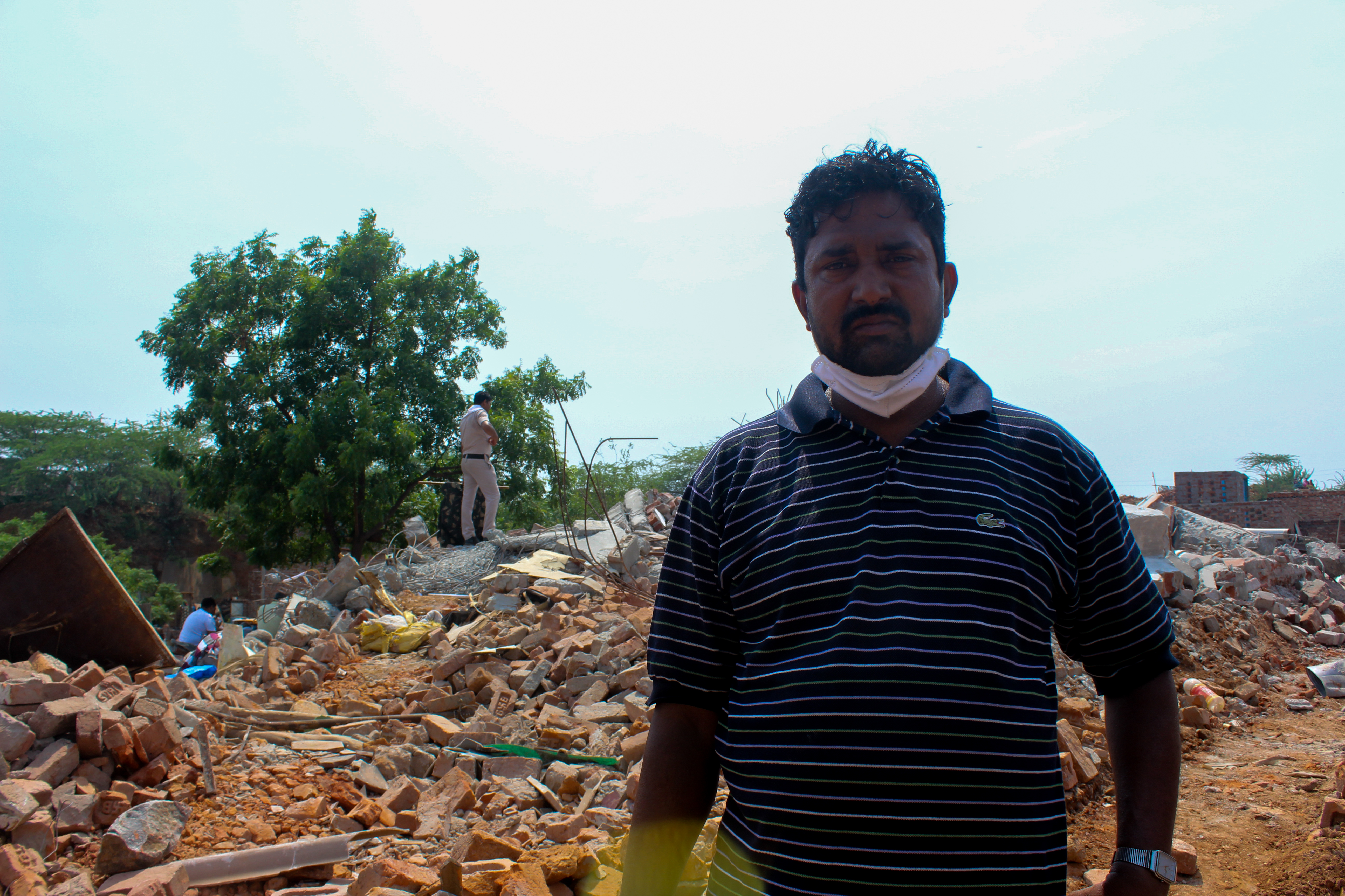 Madhukant, 42, stands on the debris of his home. | Photo by Shadab Farooq[/caption]