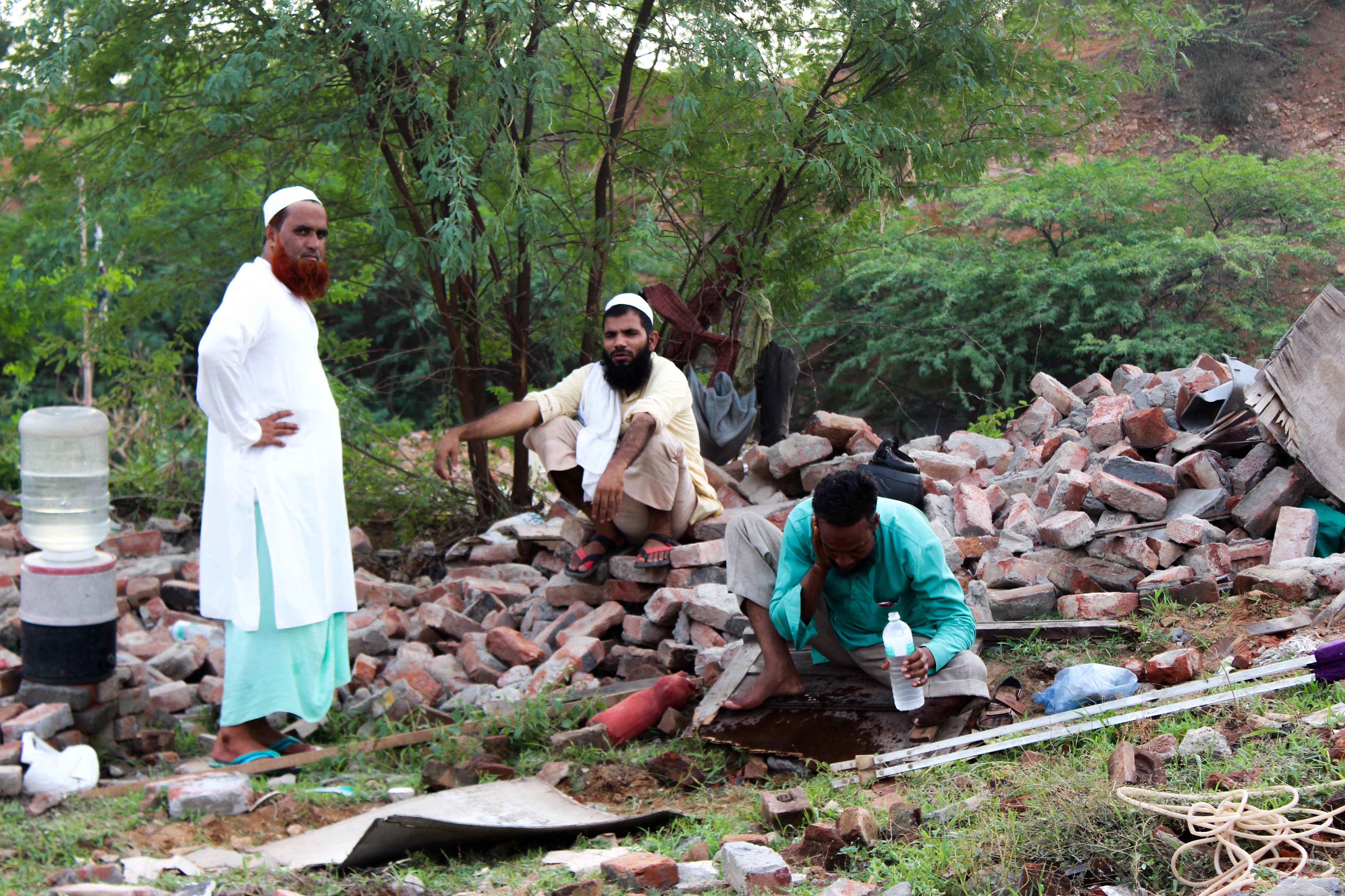 Mohd. Toufeeq (centre) with Mohd. Shahzad (left) and Mohd. Shaukeen (right), after the demolition of their homes. | Photo by Shadab Farooq[/caption]