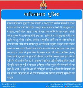 जवाब में गाजियाबाद पुलिस थाने की तरफ से एक ट्वीट कर लोनी के सीओ ने जानकारी दी के पहले ही एफआईआर दर्ज कर मामले के मुख्य आरोपी को गिरफ्तार किया जा चुका है। ट्वीट में लिखा था, "वीडियो वायरल के संबंध में पीड़ित की तहरीर पर पूर्व में ही अभियोग थाना लोनी बॉर्डर पर पंजीकृत है मुख्य अभियुक्त वर्तमान में जेल में निरुद्ध है अन्य अभियुक्त गण की शीघ्र गिरफ्तारी पर प्रकरण में आगे की कार्यवाई की जायेगी" और साथ में सीओ लोनी का एक छोटा सा वीडियो भी पोस्ट किया गया था।