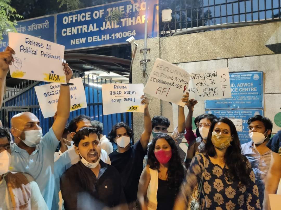 गत मंगलवार को दिल्ली हाईकोर्ट ने सुनवाई करते हुए यूएपीए के तहत गिरफ्तार देवांगना कलिता, नताशा नरवाल और आसिफ़ इकबाल को जमानत दे दी थी। हाईकोर्ट ने तीनों आरोपियों को 50-50 हजार रुपये के निजी मुचलका और उतने की रकम की दो जमानती जमा करने की शर्त पर जेल से रिहा करने का आदेश दिया था। लेकिन मंगलवार को हाईकोर्ट के आदेश के बावजूद रिहा नहीं किया गया। [caption id="attachment_442639" align="alignnone" width="261"]