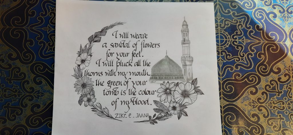 During Sultan Husain Shah’s reign, Mir Ali Haft Qalam came to Kashmir from Iran. He was a noted calligrapher. Bestowed with the title of Haft Qalam, Mulla Bakir Kashmiri was another famous court calligrapher of emperor Shah Jahan. Numerous Kashmiri calligraphers carried the legacy of calligraphy and passed it on to generations. Sobia Mushtaq is one such passionate lover of calligraphy.