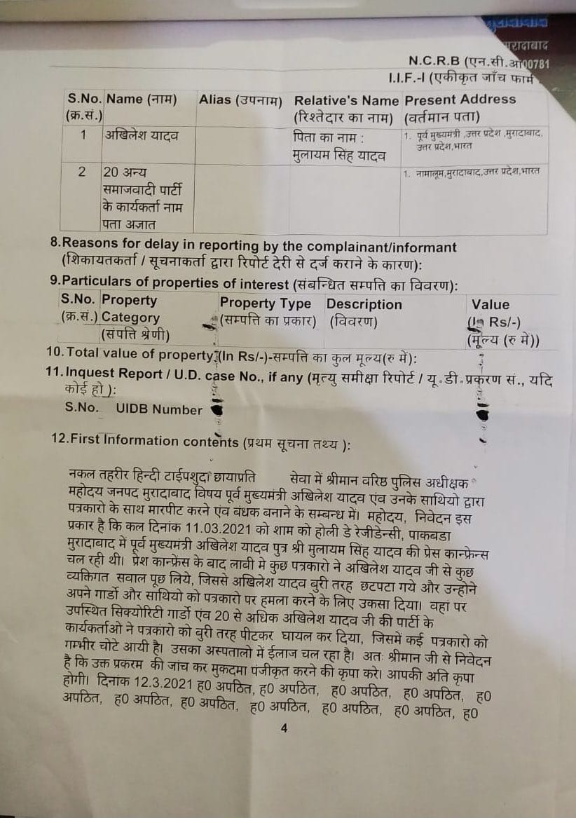 ज्ञात रहें कि 11 मार्च को मुरादाबाद में एक प्रेस कांफ्रेंस के बाद अखिलेश यादव के सुरक्षाकर्मियों समेत पार्टी के नेताओं और पत्रकारों के बीच कहासुनी और धक्कामुक्की हो गई थी। इसी दौरान पत्रकारों ने अखिलेश यादव के सुरक्षाकर्मियों और पार्टी के नेताओ पर उनके साथ मारपीट करने का आरोप लगाया था। अब इसी मामले में इंडियन प्रेस एलाइवनेस एसोशिएशन के अध्यक्ष डॉ अवधेश पराशर ने पाकबड़ा थाने में तहरीर देते हुए अखिलेश यादव समेत 20 अज्ञात सपा कार्यकर्ताओं के खिलाफ कई धाराओं में एफआईआर दर्ज करवाईं हैं। आईपीसी की धारा 147, धारा 342, धारा 323 के तहत अखिलेश यादव समेत 20 अज्ञात सपा कार्यकर्ताओं पर मामला दर्ज किया गया है।