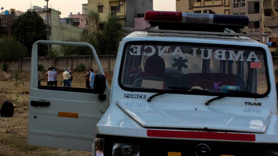 Two Ambulances waiting outside Sarai Kale Khan cremation ground in New Delhi | Photo by Shadab Farooq[/caption]