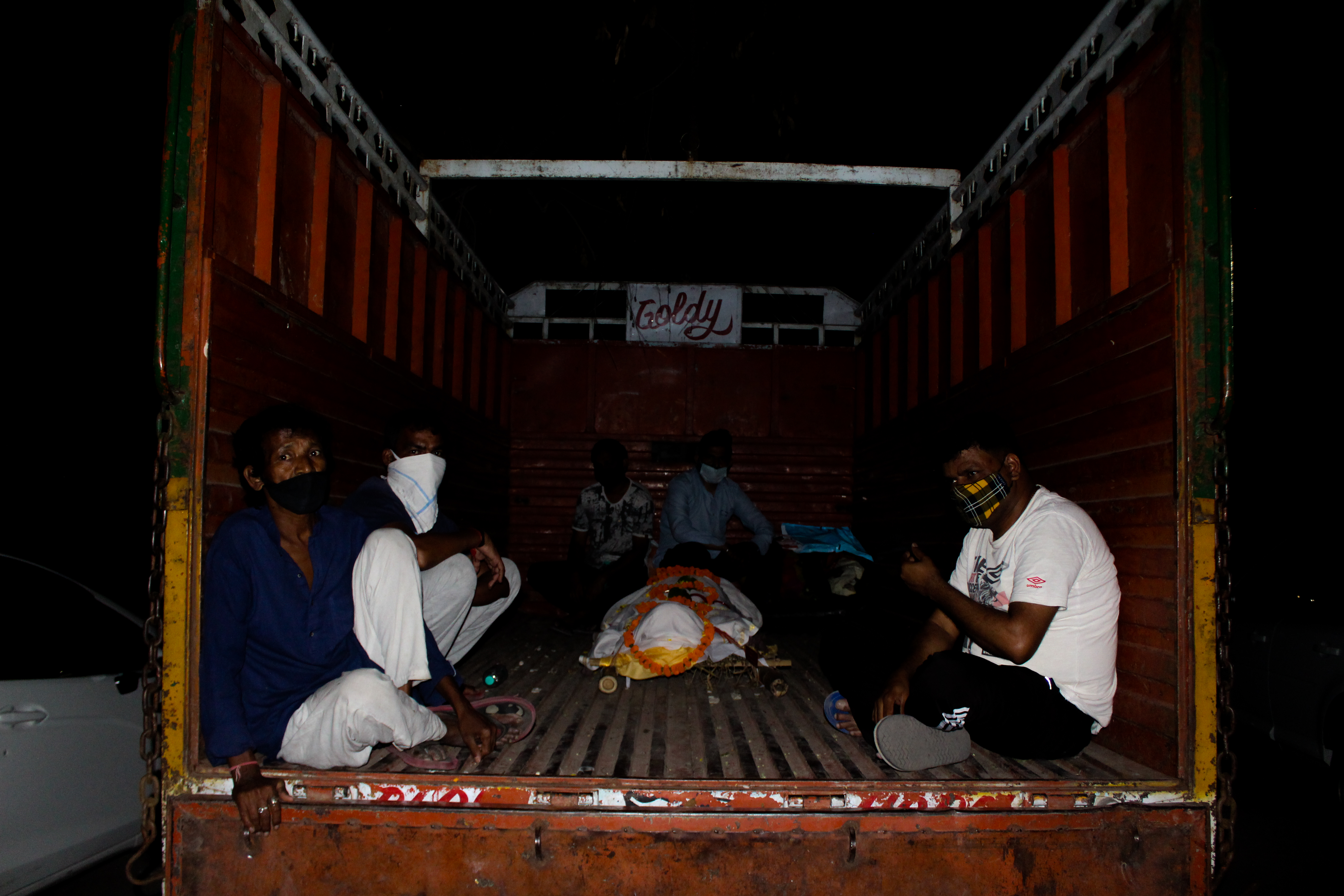 Family members waiting in the truck for their turn, outside Nigambodh Ghat for cremation. | Photo by Shadab Farooq[/caption]