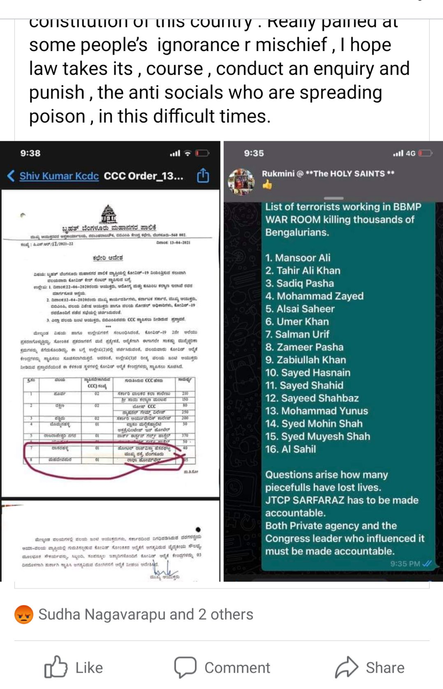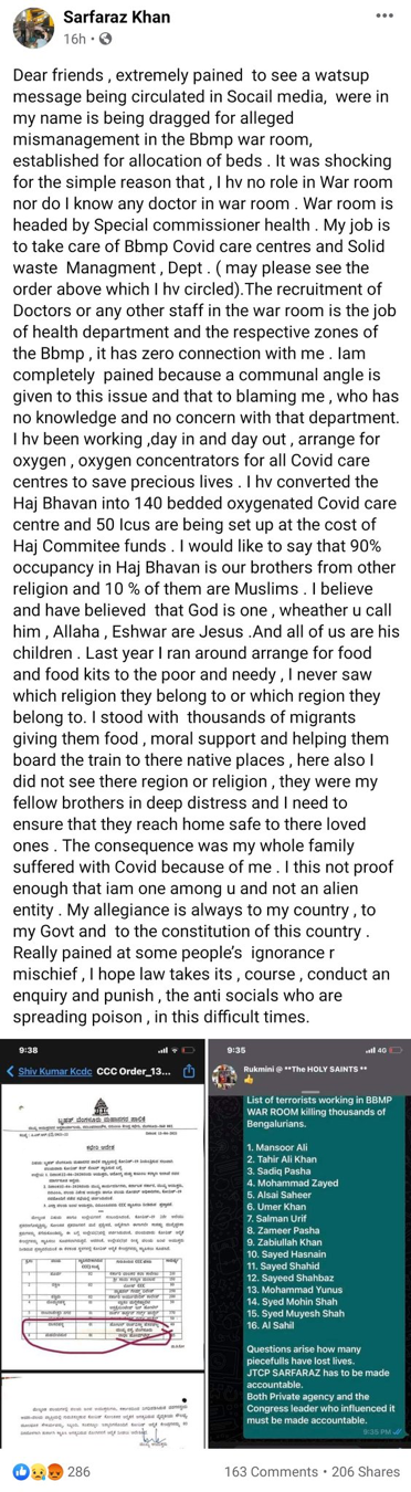 Tejasvi Surya and two other MLAs “raided” the war room to unearth an alleged bed allocation scam. BBMP has 205 employees, but Surya cherry-picked only 17 names out of 205 and read out those names in the presence of people and cameras, surprisingly all those 17 names belong to the Muslim community. Those 2 MLAs who accompanied him go on to ask if the War Room was “a madrasa” (an Islamic religious school) or a “Haj House”. Soon afterwards, the 17 Muslims were suspended and later detained by police. A list of their names started circulating on social media with the claim that “these 17 terrorists are responsible for the death of Hindu patients in Bangalore”. Sarfaraz Khan, who is the Joint Commissioner of Bangalore Municipal Corporation was blamed for it.