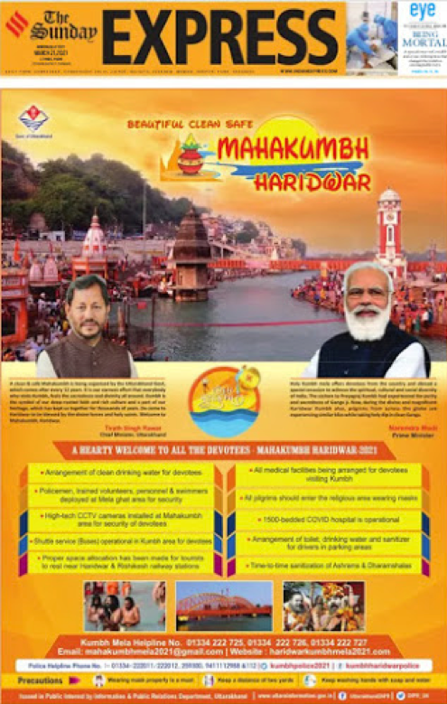 Amid the rising second wave, full-page ads in newspapers on 21 March 2021, in which Prime Minister Narendra Modi invited people to attend the Maha Kumbh in Uttarakhand.[/caption]