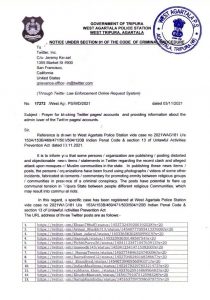 इसके इलावा त्रिपुरा पुलिस ने माइक्रो ब्लॉगिंग साइट ट्विटर को पत्र लिखकर भी कथित रूप से विकृत और आपत्तिजनक ख़बर फैलाने वाले ट्विटर के 68 प्रोफाइल को निलंबित करने के लिए कहा है। पत्र के अनुसार इन हैंडल पर कुछ पोस्ट और समाचारों में किसी अन्य घटना की तस्वीरें या वीडियो और मनगढ़ंत बयान या कमेंट्री पोस्ट किए गए हैं। पत्र में कहा गया है, "उन पोस्ट में त्रिपुरा राज्य में विभिन्न धार्मिक समुदायों के लोगों के बीच सांप्रदायिक तनाव भड़काने की क्षमता है, जिसके परिणामस्वरूप सांप्रदायिक दंगे हो सकते हैं।"