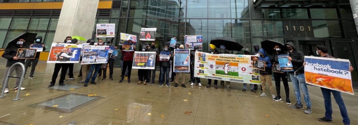 Some of the posters and placards held up by marchers said, "FACEBOOK ENABLES RACISM, FACEBOOK ENABLES FASCISM, FACEBOOK UNDERMINES DEMOCRACIES, FACEBOOK PROMOTES ISLAMOPHOBIA, FACEBOOK HATE SPEECH RULES HELP BJP IN INDIA, and FACEBOOK FAILED ITS USERS.'
