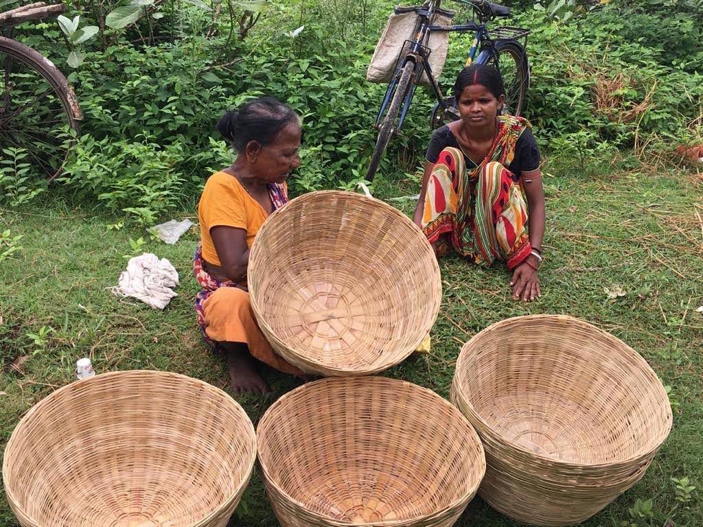 Women selling wicker baskets at the Haat. | Photo by Abhishek Basu[/caption]