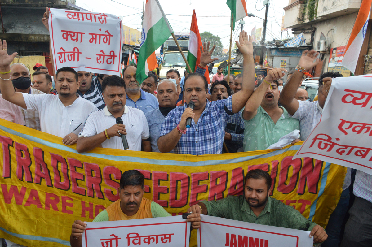 Wearing black badges to protest ‘anti-trader policies’, the business community assembled at various markets and the chamber house raising slogans like ‘Jammu Ekta Zindabad’