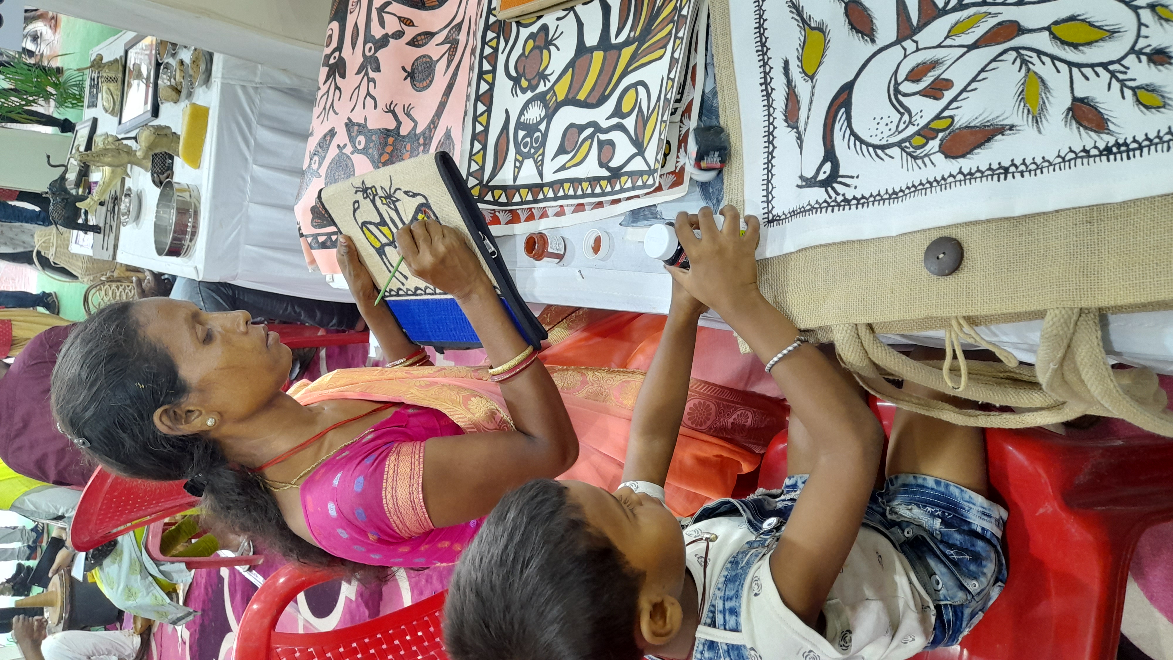 A young woman Ashamani Tudu is trained in Sohari painting, a unique tribal-style painting offered by Jharcraft, a state-government-run initiative. She has travelled 90 kilometres from Behara, Hazaribagh to attend this fair and make quick money.