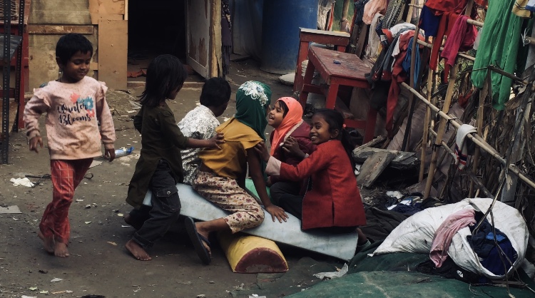 Children playing seesaw at the makeshift Rohingya camp | Photo by Shadab Farooq[/caption]